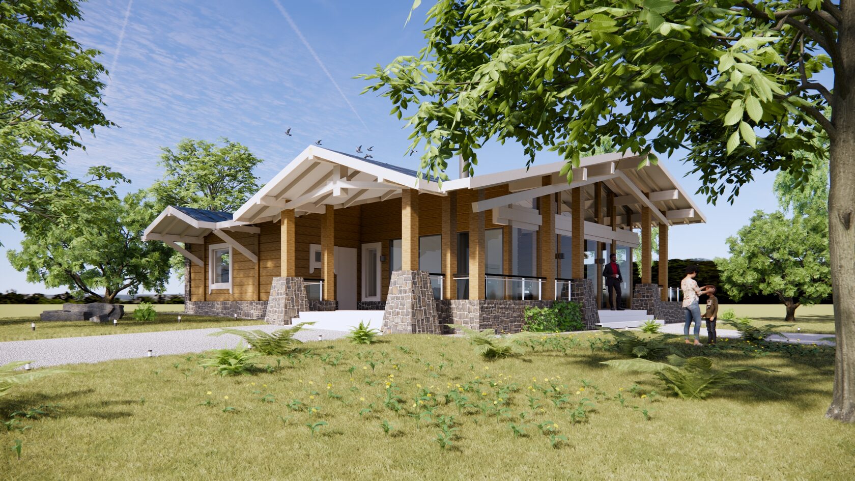 Дом проектировался для проживания молодой пары и приема гостей на выходных. Центр дома - просторная кухня-гостиная с камином, большим стеклом и выходом на террасу. Также в доме запланированы парная с душевой и выходом на террасу. Прихожая и парная просторнее, чем обычно, ведь хозяева дома планируют принимать много гостей.