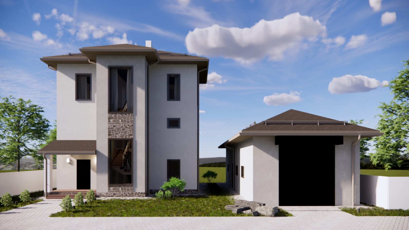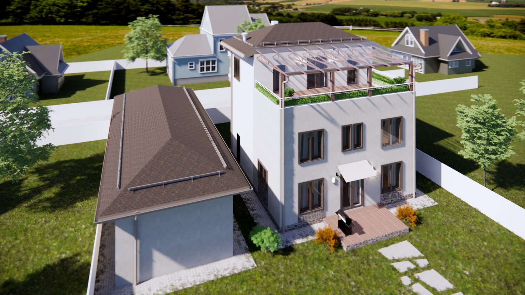 Дом расположен на компактном для такого наполнения участке и чтобы не застраивать всю площадь было принято решение жилой дом сделать трехэтажным и оставить место для газона.